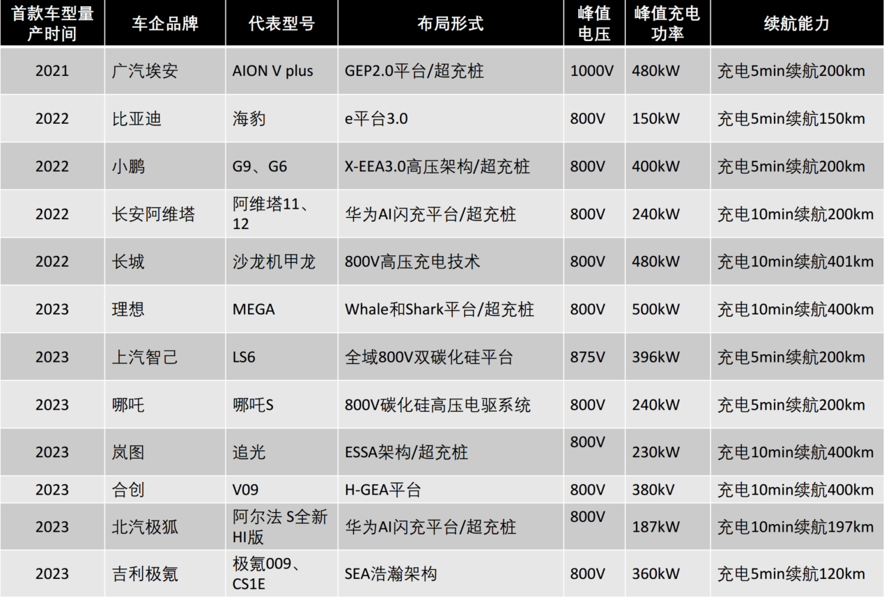 要實現10分鐘充電,就得實現800V/600A的高壓大電流超充,當前主流車企均已推出800V平臺,支持10分鐘超充的旗艦車型。小鵬G9搭載的800V超快充平臺配合S4超快充樁,可以實現充電10分鐘增加續航500公里;廣汽埃安搭載石墨烯基電池,可以實現8分鐘充滿80%電量;吉利極氪更是發布了600kW超充技術。除此之外,理想、嵐圖、長城、路特斯等車企也在積極布局,占領電動汽車高端品牌的陣地。而此次神行電池的橫空出世,使得超充電池可以成為每臺電動車的標配產品,超充時代的全面到來從今天開始。